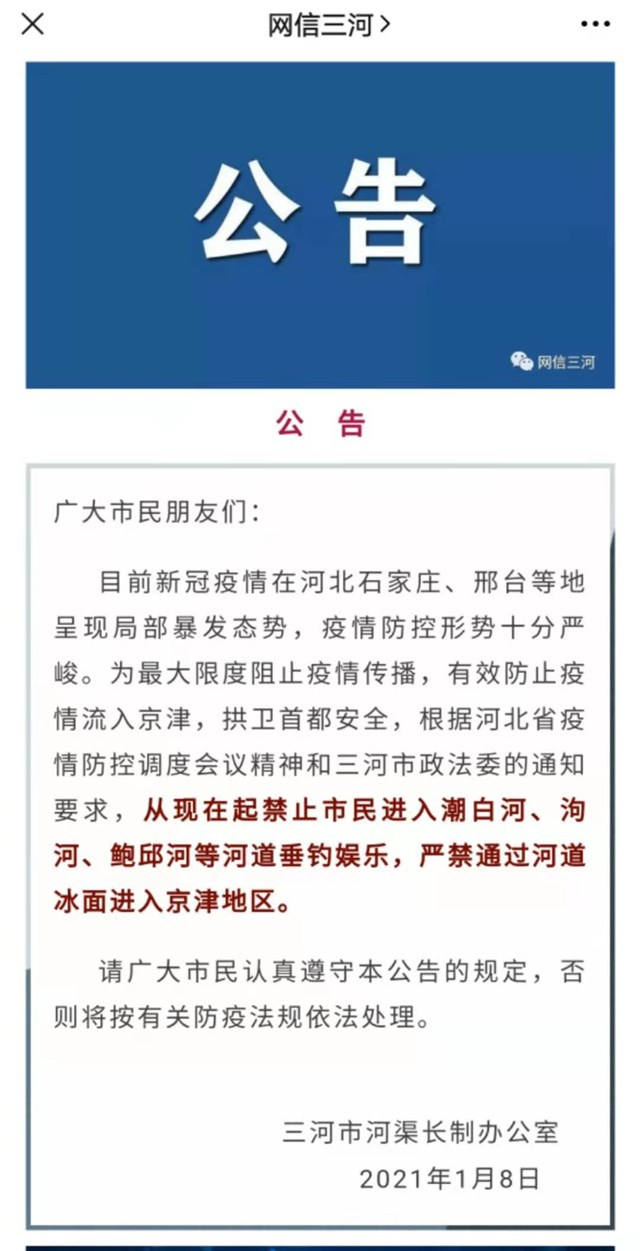 防控,不可谓不严密。早在1月8日,“网信三河”微信公众号就曾发布公告,禁止市民进入潮白河、泃河、鲍邱河等河道垂钓娱乐,严禁通过河道冰面进入京津地区。