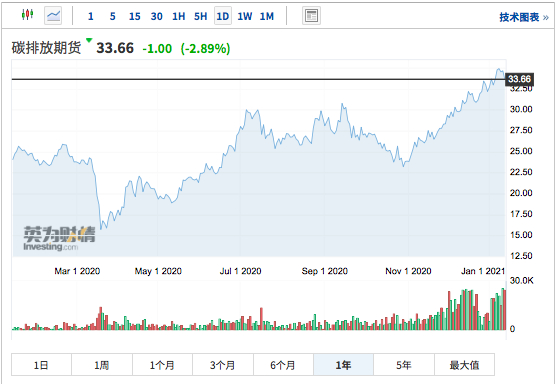 洲际交易所碳排放期货在去年12月时就涨至32.08欧元一吨,相当于39.08美元一吨,创下历史新高。而进入1月,继续上涨,截至今日(14日)午间,报33.66欧元/吨,再创新高。