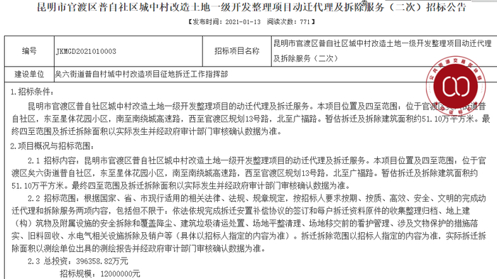 1月13日,昆明公共资源交易网发布“普自社区城中村改造土地一级开发整理项目动迁代理及拆除服务(二次)招标公告”。公告显示,该拆迁项目改造总投资达39.6亿元,预计拆除建筑面积51.1万平方米,计划开工时间为今年2月20日,竣工时间为8月20日,预计半年时间完工。