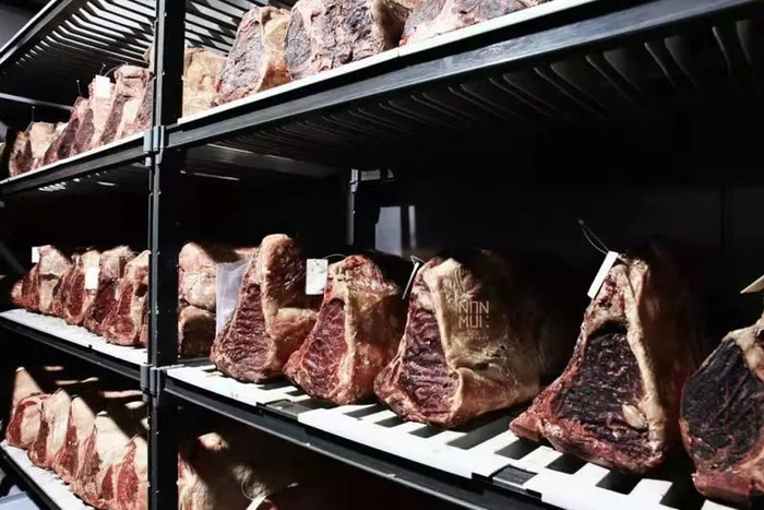 干式熟成牛排制作工艺也非常复杂,需要把整个大块的牛肉放置在0—4℃恒温、恒湿且通风的环境里,让牛肌肉中的血水慢慢流尽、表层风干硬化。一般情况下,28天,内层牛肉自然分解产生酵素,过程中产生的鲜美肉汁会被外壳封锁在其中,渗透入纤维组织,肉质会比新鲜的更加软嫩,口感也会越发浓郁而富有层次,这就是“熟成”带来的改变。