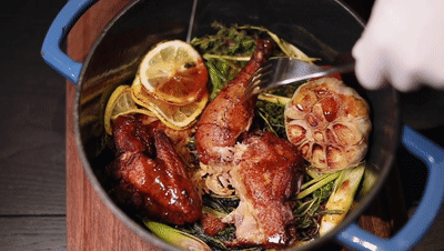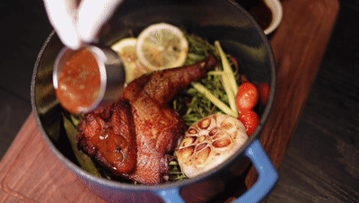 鸡品选用的是广东清远仔鸡,它需要先用秘制酱汁腌制4小时,然后用真空封后低温慢煮4小时,做的时候会放进三种香料,分别是迷迭香、百里香、香茅草,提味又不会夺味,刚刚好!