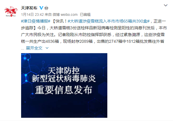1月14日,经天津市疾控中心复核,核酸检测结果仍为阳性。目前,批号20210105的巧克力口味雪糕,生产1588箱(每箱6盒),库存304.8箱;批号20210106的草莓口味雪糕,生产1627箱(每箱6盒),库存697箱;批号20210107的香芋口味雪糕,生产1621箱(每箱6盒),库存1250.8箱。