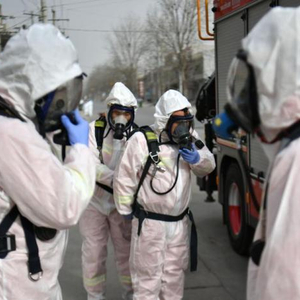 1月15日,石家庄消防救援支队藁城大队消防员在小果庄村村口路段消杀。当日,河北省石家庄市藁城区开展防疫消杀工作。 中新社记者 翟羽佳 摄
