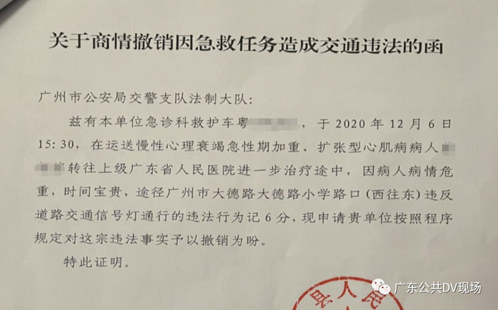 近日,广州交警收到一宗救护车违反交通信号灯通行的违法行为撤销申请。