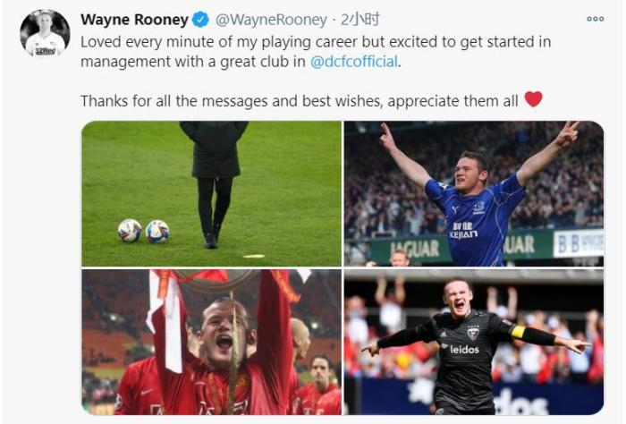 在宣布挂靴的推文中,鲁尼上传了4张图片。从埃弗顿到曼联,从华盛顿到德比郡,那是他迄今为止的人生。