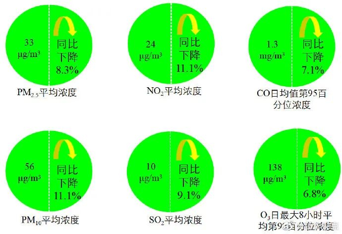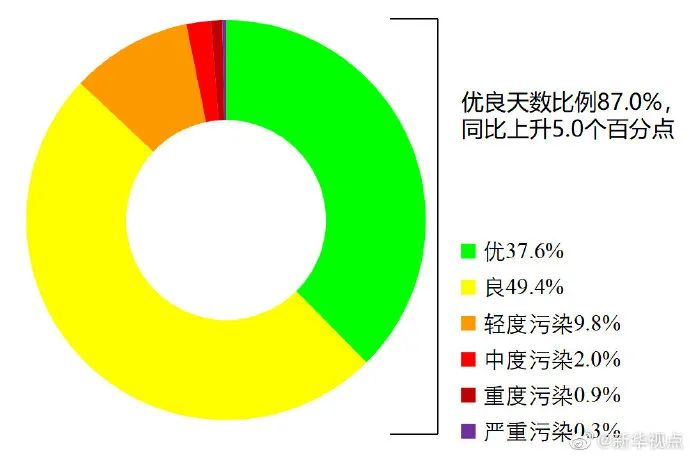 2020年,全国337个地级及以上城市平均优良天数比例为87%,同比上升5个百分点;PM2.5平均浓度为33微克/立方米,同比下降8.3%。