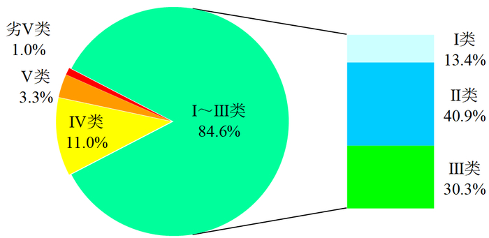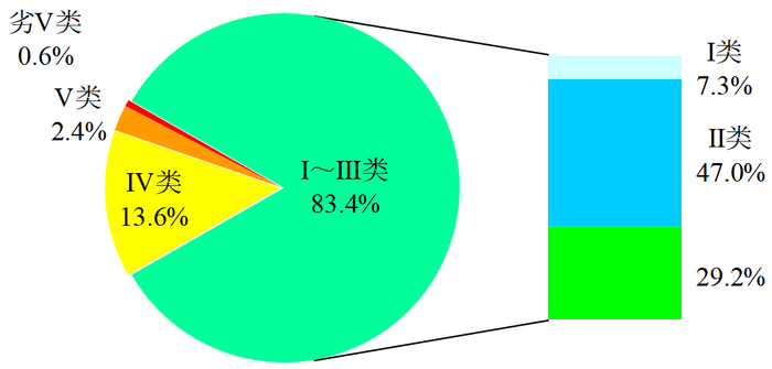 2020年1-12月,1940个国家地表水考核断面中,水质优良(Ⅰ~Ⅲ类)断面比例为83.4%,同比上升8.5个百分点;劣Ⅴ类断面比例为0.6%,同比下降2.8个百分点。主要污染指标为化学需氧量、总磷和高锰酸盐指数。