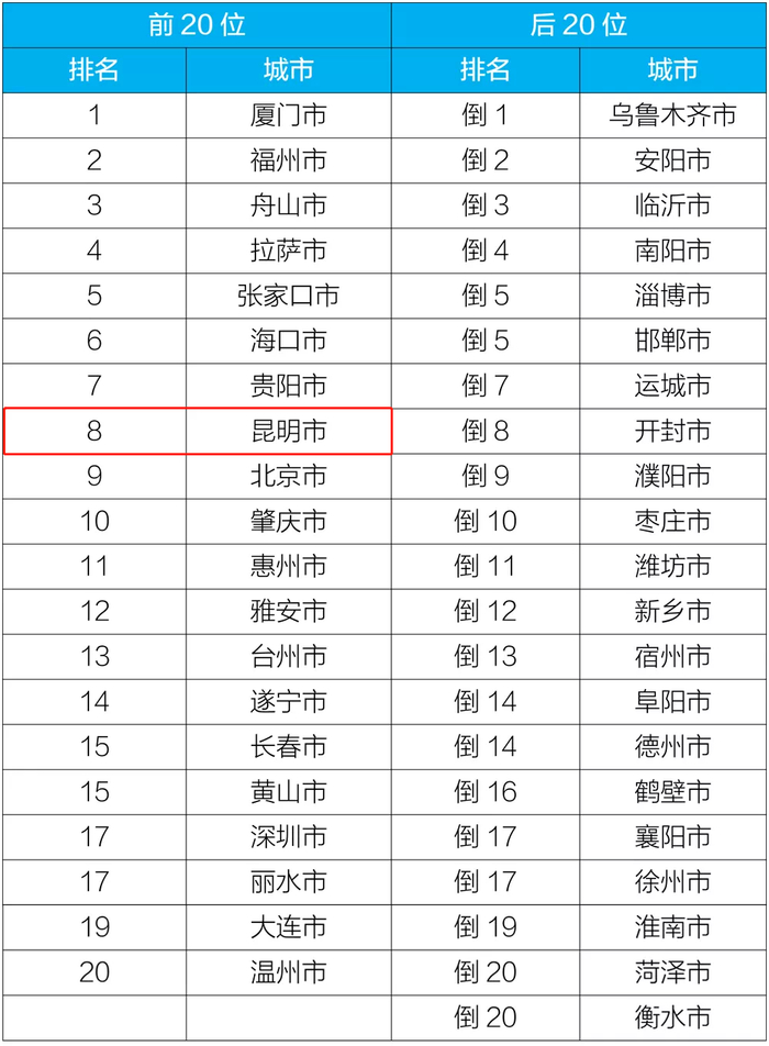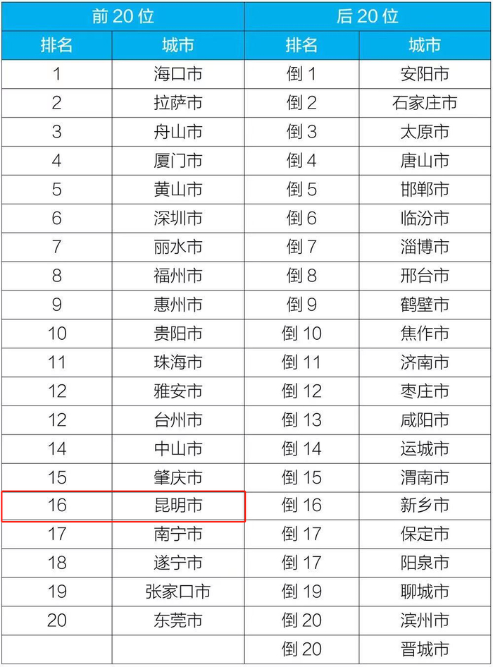 原标题:这20个城市,2020年空气质量最好!昆明排第16名