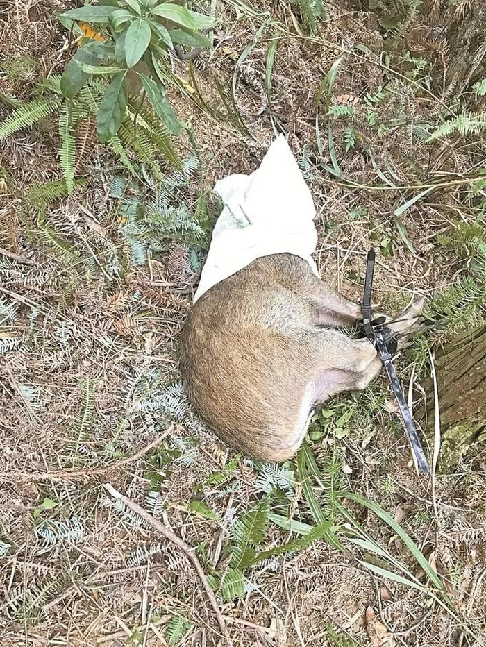 2020年11月1日深夜,几头野猪像以往一样,大摇大摆地闯进了苏铁园旁边的小山包。它们前后拉开一两米的距离,一边慢慢沿着被它们踩出来的兽道行进,一边漫不经心地用长长的猪嘴在地面上轻轻拱着什么。突然,一头小猪的前腿像是不小心踩空了,只见它猛地跳了起来,然后疯狂地向旁边的密林中逃去,不过腿上已经被一根绳索牢牢套住,没逃几步就再也不能前行。旁边的几头野猪见状魂飞魄散四散奔逃,转瞬间就跑得无影无踪。而那只被套牢的小野猪则一边拼命挣扎一边大声哀嚎,仿佛是在向它的同类求救。不久,小野猪似乎发现自己所有的努力完全都是徒劳,这才慢慢消停下来,乖乖地趴在地上放弃了“抵抗”。