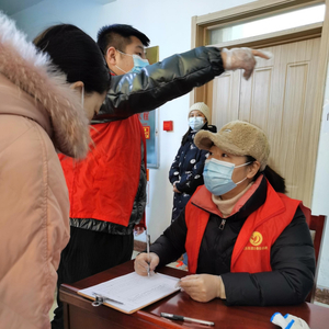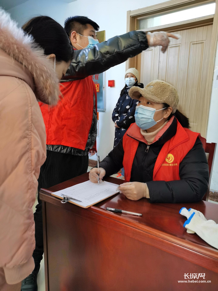 中国人保财险石家庄市分公司党员志愿者付彬彬(右一)登记社区核酸检测人员信息。