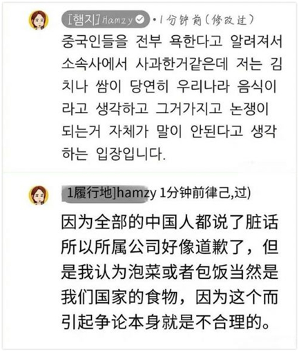 但不久后,中国网友发现她和韩国网友互动时与上述口径并不一致,称“道歉是中国所属公司道的,并不认为自己有错”。