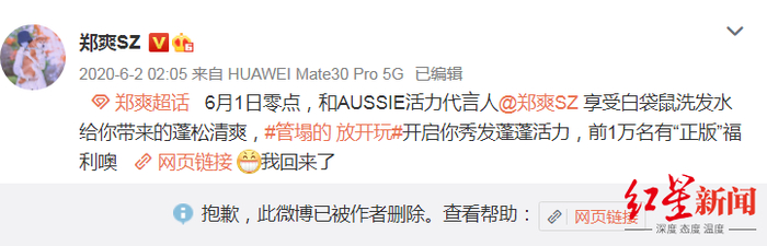 和郑爽有合作的袋鼠洗护发等各方的官方微博删除了郑爽代言或拍摄的相关动态,今日上午其个人微博中的部分代言内容也做了删除。