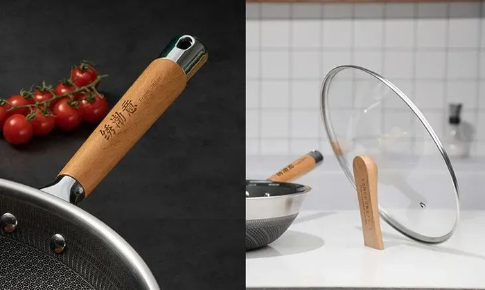 锅柄是榉木的,可以隔热防烫。尾部还有挂孔,平时可以悬挂收纳省空间。