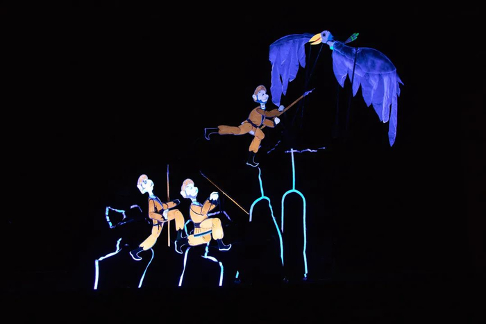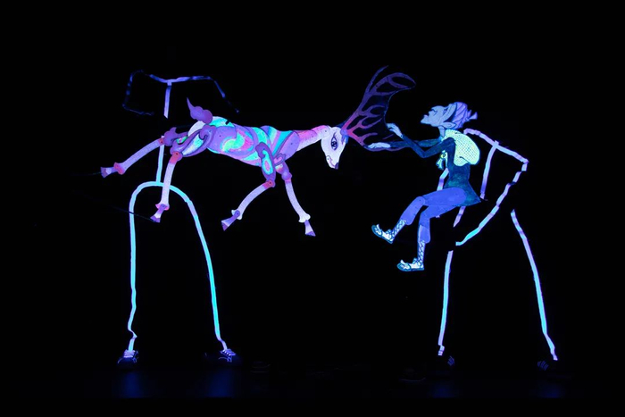 一帧帧精致的画面,简约而富有诗意,这是木偶剧团首次尝试荧光皮影与传统皮影交汇融合的创新。