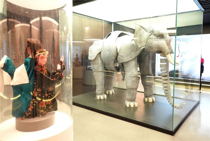 在展厅的中心位置,一眼就可以看到木偶剧团十部代表剧目里的经典形象,《孙悟空三打白骨精》《花木兰》《卖火柴的小女孩》《春的畅想》《东郭与狼》等依次排列,还有《最后一头战象》中1:1还原制作的战象嘎羧。