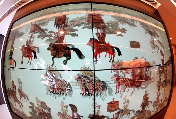 由民间皮影雕刻大师薛宏权雕刻的《皇帝出巡图》,原作品有108米长,在之前的展示厅中只做了部分实物展出,此次设计团队用多媒体技术将整个作品进行了相对完整的再现复原。