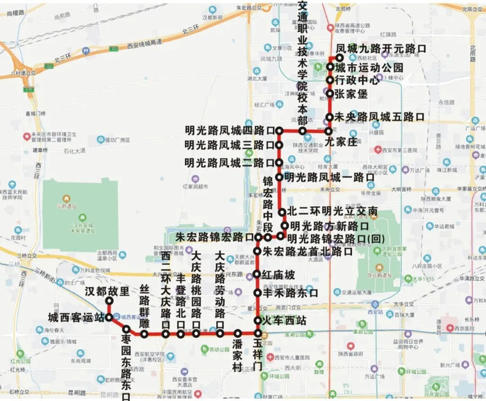 线路设置站点30个:汉都故里、城西客运站、枣园东路东口、丝路群雕、西二环大庆路口、丰登路北口、大庆路桃园路口、大庆路劳动路口、潘家村、玉祥门、火车西站、丰禾路东口、红庙坡、朱宏路龙首北路口、朱宏路锦宏路口、锦宏路中段、明光路锦宏路口(回)、明光路方新路口、北二环明光立交南、明光路凤城一路口、明光路凤城二路口、明光路凤城三路口、明光路凤城四路口、交通职业技术学院校本部、尤家庄、未央路凤城五路口、张家堡、行政中心、城市运动公园、凤城九路开元路口。