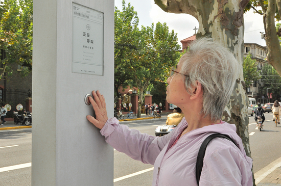 一位上海市民正在体验“社区申程出行代叫点”功能。有分析认为,一旦各平台的“打车助手”产品与老年人出行的高频场景更好地结合起来,老年人面前的“数字鸿沟”将得到更好地解决。