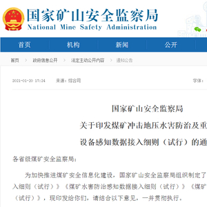 原标题:国家矿山安监局印发煤矿冲击地压水害防治及重大设备感知数据接入细则(试行)
