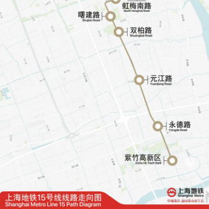 15 号线起自闵行区的紫竹高新区站,止于宝山区的顾村公园站。途经闵行、徐汇、长宁、普陀和宝山,共5个行政区,连接9座高校,3个国家级科创园区,全长近43公里,初期运营共开通29站,均为地下车站。