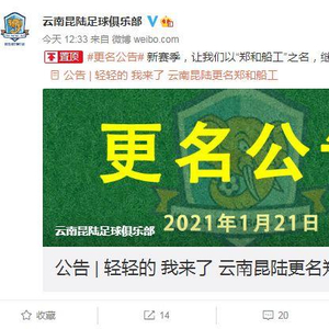 中新网客户端1月21日电 21日,中乙球队云南昆陆足球俱乐部宣布正式更名为昆明郑和船工足球俱乐部,这一名称也获网友点赞。
