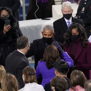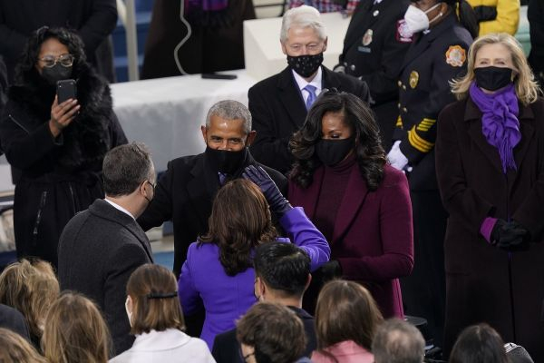 资料图片:总统就职典礼上,哈里斯和希拉里都身穿紫色服装。(美联社)