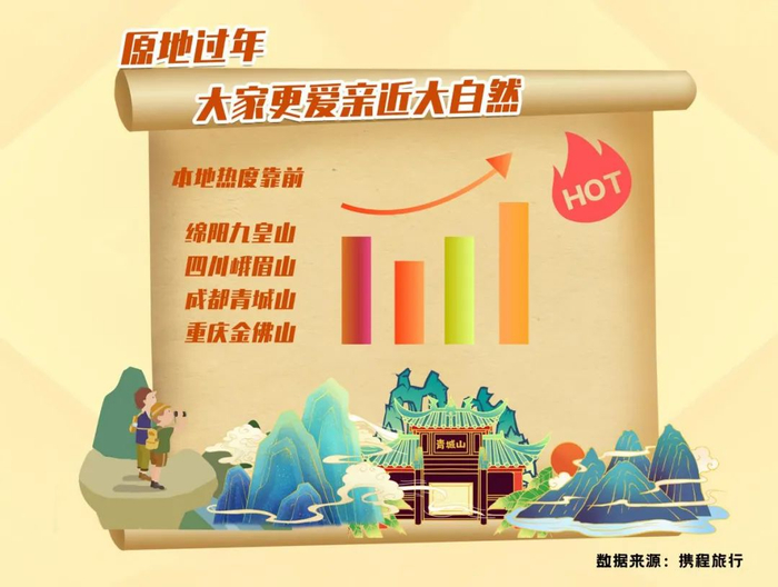 心有多大,世界就有多大。携程数据显示,当地及周边小而美的景点成本地出行首选。滑雪和温泉依然是本地热搜的宠儿。其中,成都西岭雪山、湖州云上草原星空滑雪场、贵阳万象温泉、西安临潼悦椿温泉等搜索热度均有上涨。原地过年,大家更愿意亲近自然。绵阳九皇山、四川峨眉山、成都青城山、重庆金佛山本地热度靠前。减少聚集,登高望远,呼吸新鲜空气,也被写进了大家原地过年的日程表中。