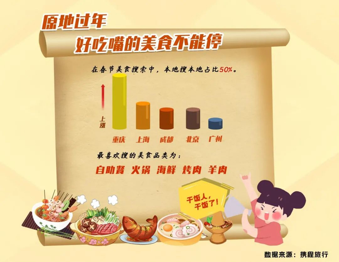 重庆、上海、成都、北京、广州为本地热搜美食热门城市top5。其中,重庆本地美食搜索上涨约30%,上海则上涨15%左右。从携程数据中可看出,自助餐、火锅、海鲜、烤肉、羊肉等美食品类最受大家欢迎。据了解,针对原地过年的趋势,携程美食林推出了年夜饭系列的餐厅套餐,还将推出“时尚摩登小酒馆”、“传统上海味道”系列主题的餐厅套餐活动,结合当下最火的直播形式,给用户带来新一年的美味。