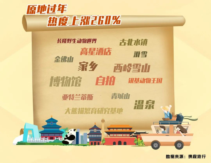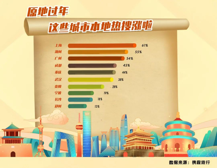 同时,携程首发“原地过年宝典”,不出远门也能看到诗和远方。通过用户最新搜索行为分析:当前,原地过年热度上涨260%。在整体搜索量中,本地出行热搜量占比超40%。