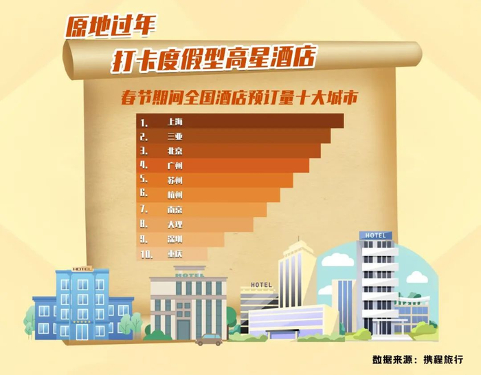 “酒店度假”也是一种原地过年的方式。不离开城市,不出远门,不少用户选择一家人在度假型高星级酒店过年。酒店开阔的环境,多功能场景,提供了更多休闲放松的空间。携程数据显示:截止目前,春节酒店订单量中,高星酒店占比约为66.8%。上海、三亚、北京、广州、苏州、杭州、南京、大理、深圳、重庆为今年春节期间全国酒店预订量前十城市。上海金茂君悦大酒店、上海南郊宾馆、上海东方佘山索菲特大酒店、三亚·亚特兰蒂斯、上海浦东嘉里大酒店深受用户喜欢。听音乐,泡温泉,和孩子在酒店乐园嬉戏,也能享受过年的欢乐。