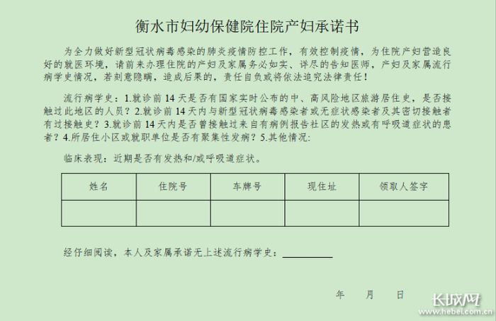 此外,孕产妇需下载并签署《衡水市妇幼保健院住院产妇承诺书》。孕产妇如有急诊及其他特殊情况,请就近就医。