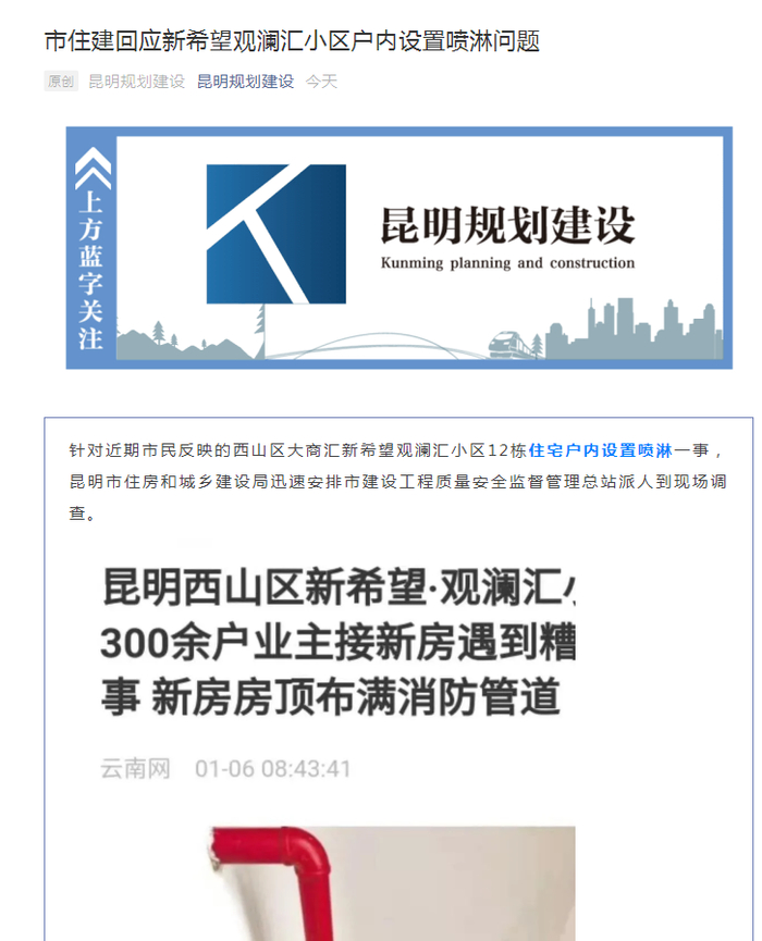 原标题:昆明市住建局回应新希望观澜汇小区户内设置喷淋问题