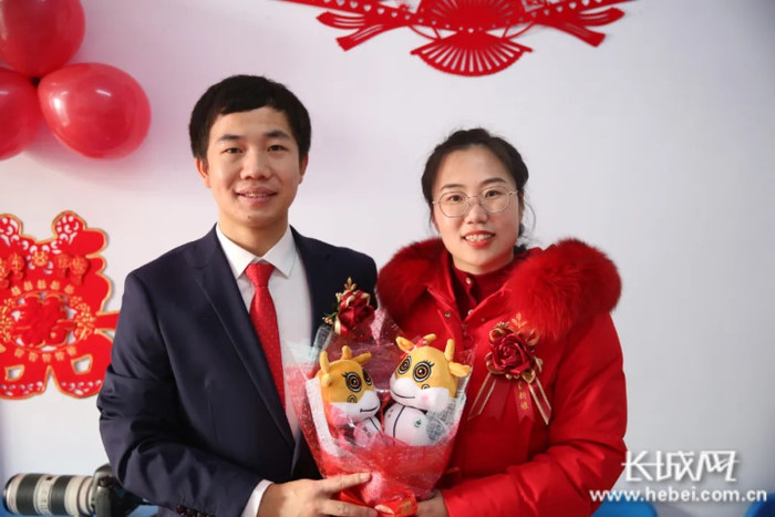 2020年,由于受疫情的影响,王勇、时红艳两位老师将原定的婚礼向后推迟一年。今年1月,他们推迟后的婚期临近,但河北省又出现了局部聚集性疫情,为了遏制疫情传播,不耽误学生们的教育教学,两位老师自愿封闭在校,为学生的健康发展保驾护航。双方父母商议后,决定婚期不变,让两人安心工作,老家的婚礼由父母主持简办,于是就出现了这一对新人的特殊婚礼。