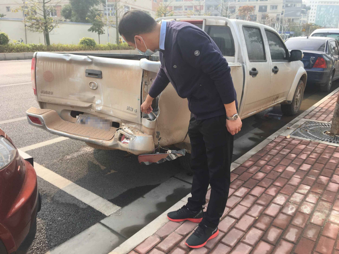 在朱先生领引下,记者在南宁金湖北路一家汽车维修公司对面的马路边,见到了涉事的长城皮卡。记者看到,该车的货厢尾部已被撞凹变形,右尾灯也损坏脱落。