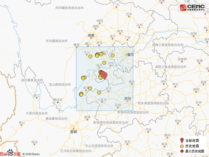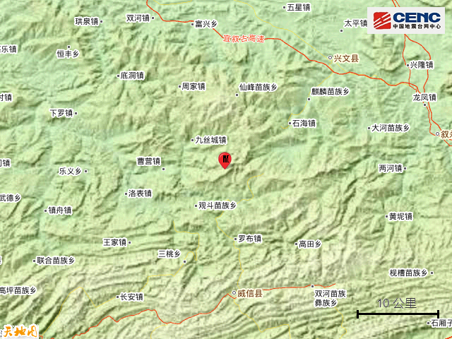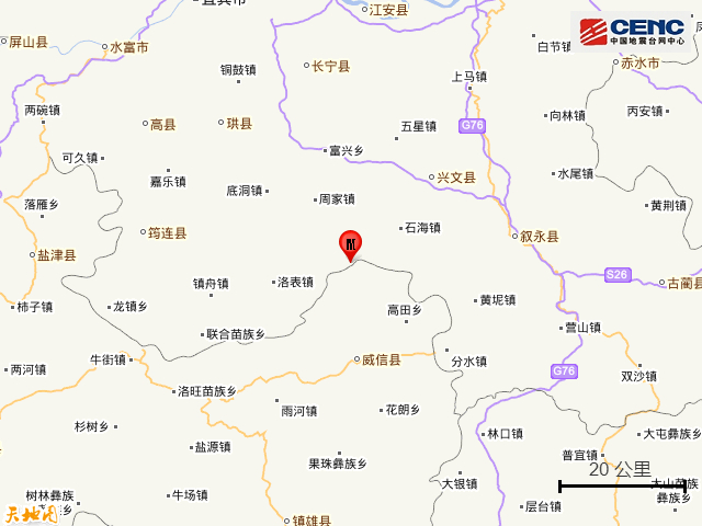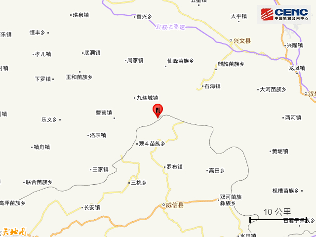 震中简介:珙县隶属于四川省宜宾市,南与大雪山相连,与云南省威信县隔山相望。地势南高北低,以中低山地为主,气候温暖湿润。珙县是四川省重要的能源、建材、化工基地。该县面积1145公里,下辖6乡11镇,2014年人口约37万,2014年GDP达115亿元。