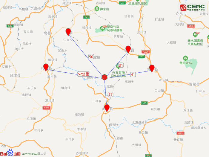 周边县城:震中距云南威信县27公里、距兴文县31公里、距叙永县41公里、距珙县50公里、距筠连县52公里,距宜宾市83公里,距重庆市221公里。