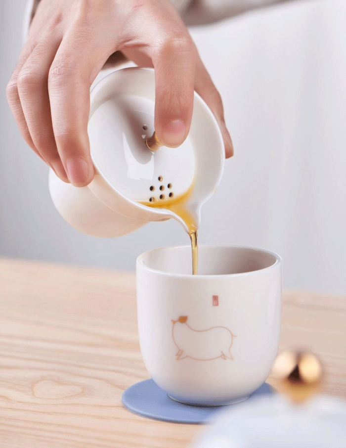 温润的杯面,似偷了梨蕊的三分白,映着金线勾勒成的灵物,分外可爱俏皮。