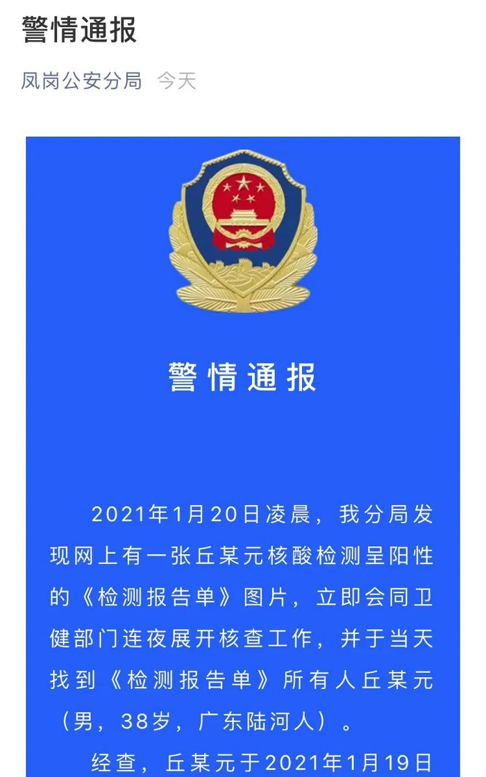 警方通报称,2021年1月20日凌晨,东莞市公安局凤岗分局发现网上有一张丘某元核酸检测呈阳性的《检测报告单》图片,立即会同卫健部门连夜展开核查工作,并于当天找到《检测报告单》所有人丘某元(男,38岁,广东陆河人)。