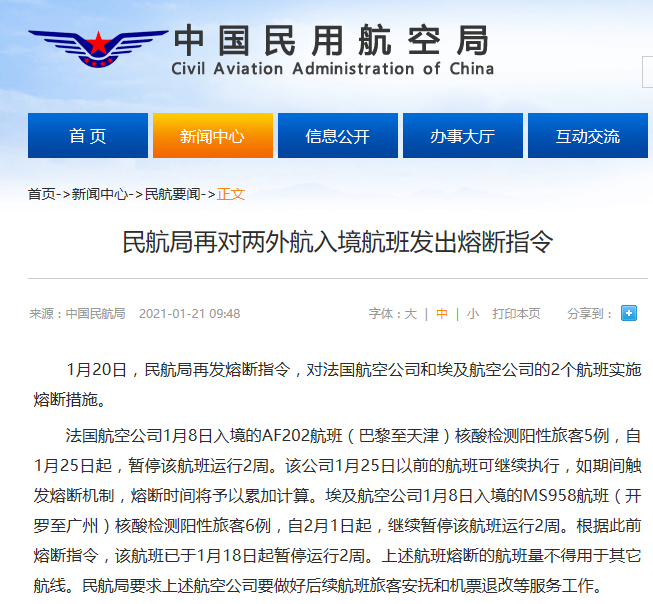 1月20日,民航局再发熔断指令,对法国航空公司和埃及航空公司的2个航班实施熔断措施。