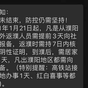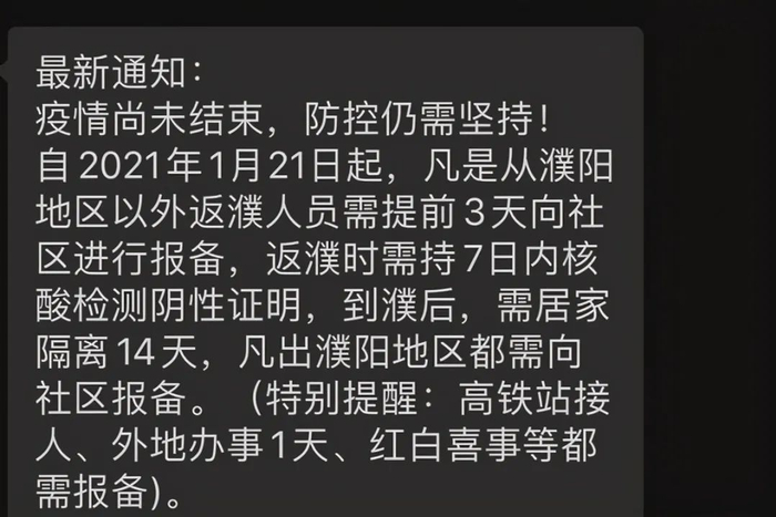 但是濮阳市一社区居委会也在当天发布了一份通知,称自2021年1月21日起,凡从濮阳地区之外的返濮人员,需做三件事:提前3天向社区报备、持7天内核酸检测阴性证明、到濮后居家隔离14天。