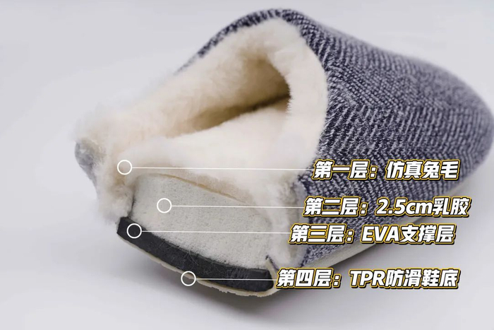 货真价实的4层大底才能做出一双拖鞋,仿真兔毛保暖层+泰国进口乳胶填充层+EVA支撑层+TPR防滑鞋底。