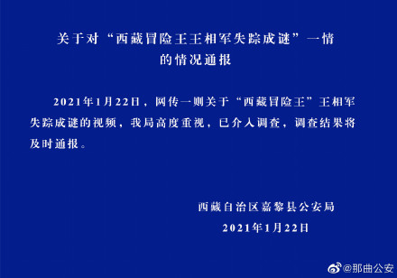 1月22日晚,西藏嘉黎县公安局发布《关于对“西藏冒险王王相军失踪成谜”一情的情况通报》称:“2021年1月22日,网传一则关于“西藏冒险王”王相军失踪成谜的视频,我局高度重视,已介入调查,调查结果将及时通报。”