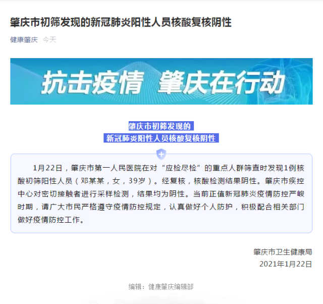 1月22日,肇庆市卫生健康局发布,肇庆市第一人民医院在对“应检尽检”的重点人群筛查时发现1例核酸初筛阳性人员(邓某某,女,39岁)。经复核,核酸检测结果阴性。
