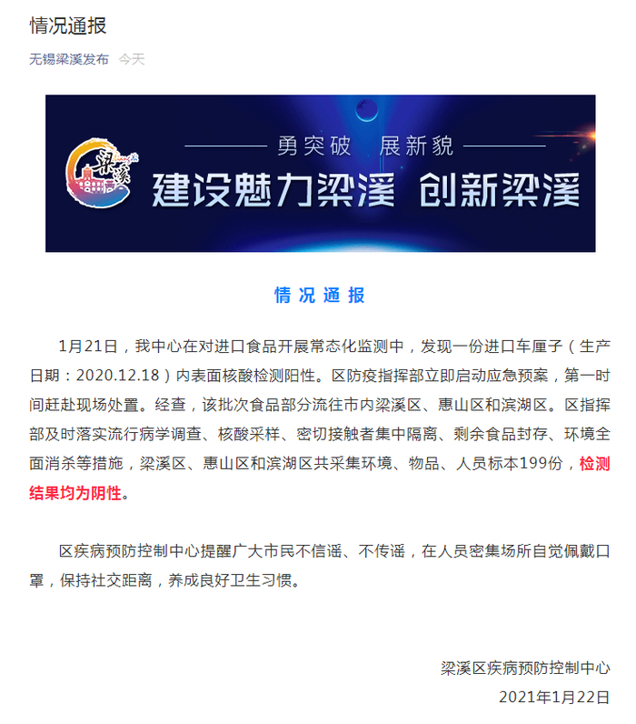 1月21日,梁溪区疾病预防控制中心在对进口食品开展常态化监测中,发现一份进口车厘子(生产日期:2020.12.18)内表面核酸检测阳性。区防疫指挥部立即启动应急预案,第一时间赶赴现场处置。经查,该批次食品部分流往市内梁溪区、惠山区和滨湖区。区指挥部及时落实流行病学调查、核酸采样、密切接触者集中隔离、剩余食品封存、环境全面消杀等措施,梁溪区、惠山区和滨湖区共采集环境、物品、人员标本199份,检测结果均为阴性。