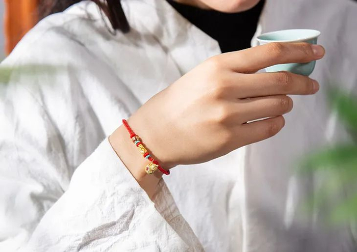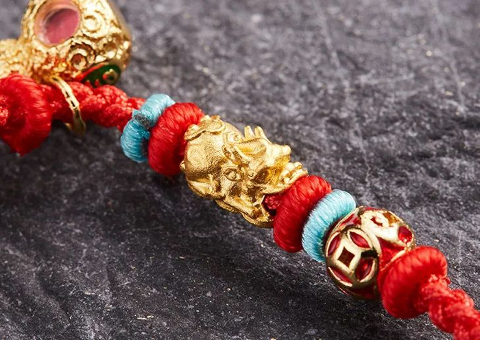 细看这红绳,其上竟串了中国传统吉祥三宝——貔貅、葫芦、转运珠,为自身的好福气锦上添花,加了不少好财运。