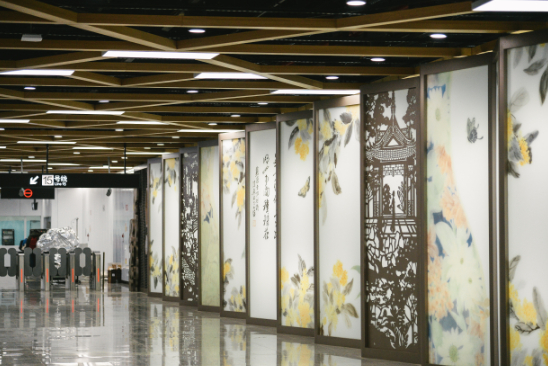 一路往南是桂林公园站,得益于沪上著名的园林之利,桂林公园站以横梁金属的隔窗再现了古典园林的亭台水榭,湖光山色,翻飞的蝴蝶,花鸟虫鱼。笔力遒劲的书法,风格婉约的工笔,铝板烤漆的模拟灵璧散发着古韵新香,车站仿佛进入公园的玄关。