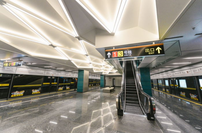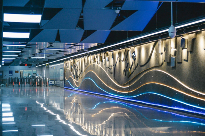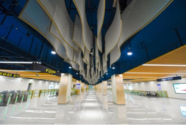 15号线南端的紫竹高新区站,是历史上“冈身”沙堤的入海处。建设者们采用海沙作为墙面艺术装饰的主体,配以灯带镶嵌,划出层层海浪波纹,暗示了海纳百川的博大胸襟。车站的装饰材料,改变了以往以金属板一统天下的局面,更多地逐渐使用陶板等材料,赋予车站更多质感。