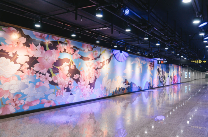 站厅的墙壁上粉色的樱花为主色调的大型艺术装置《绽放春天》,描绘了暖风拂面,万物复苏的春天景象,一辆地铁伴着片片花瓣“驶向春天”,四周飞禽白鹭环绕飞舞,嬉笑的孩童天真烂漫,报春的喜燕勾勒出欢快和谐的主题,传统工艺与当代情景在此交相辉映。