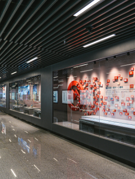作为15号线最大换乘站的上海南站,和高铁、普铁、公交以及轨交1号线、3号线交汇。冲孔铝板的天庭隔断,交织成有规则菱形花纹,几近透明的色彩,具有透视效果的引导通道,轻松化解了大客流转换给人们带来的心理压力。