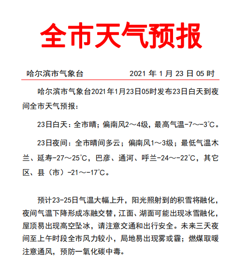 黑龙江省气象台2021年1月23日17时发布23日夜间至26日白天全省天气预报: